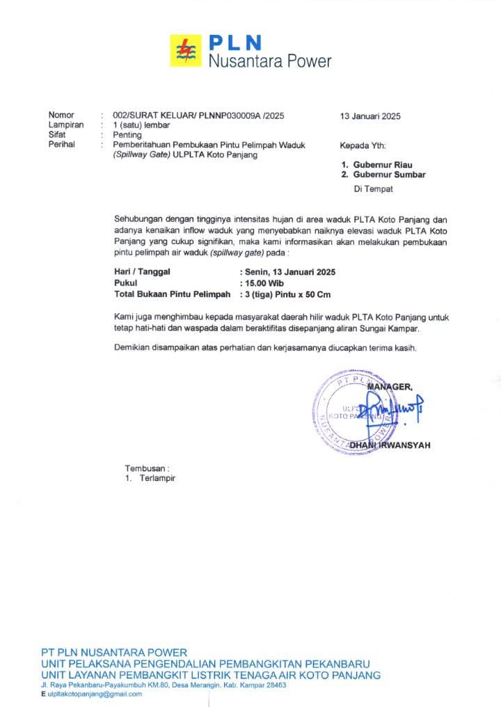 Dengan adanya kenaikan inflow waduk yang menyebabkan naiknya elevasi di Waduk PLTA Koto Panjang yang cukup signifikan maka hari ini pengelola Waduk Unit Layanan Pembangkit Listrik Tenaga Air (PLTA) akan melakukan pembukaan pintu pelimpahan (Spillway Gate), sebanyak 3 pintu x 50 cm pada Pukul 15.00 WIB, Senin (13/1/2025).